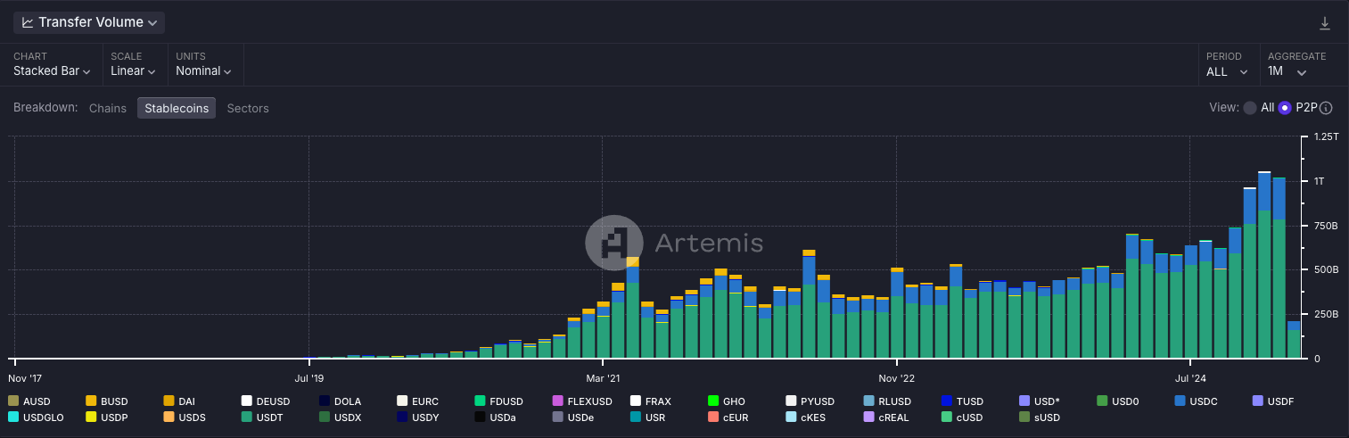 Artemis published data that stablecoin P2P transfer volumes exceeded $1 trillion in January for the second consecutive month.